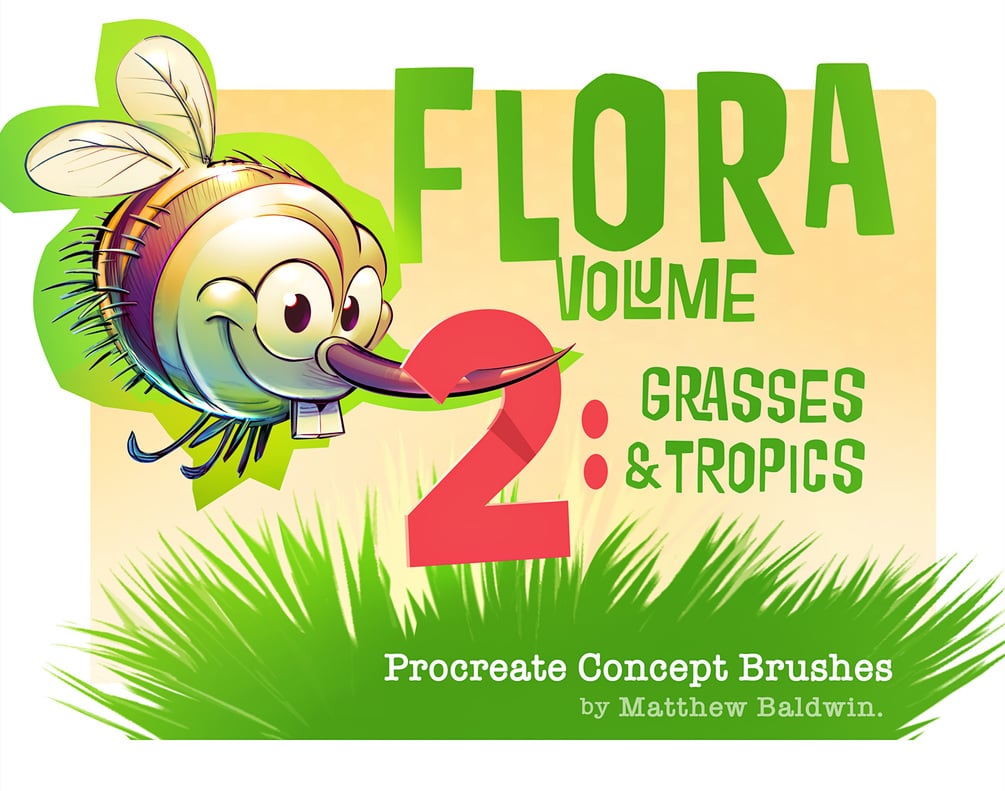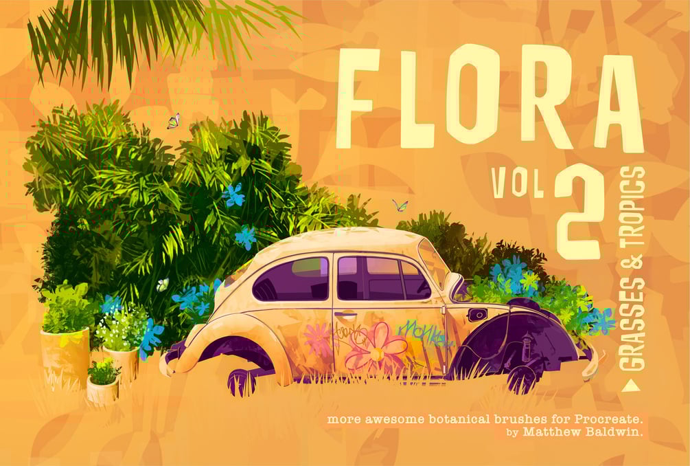 Welcome to Flora 2, a bundle of 150 all-new botanic brushes for Procreate. This set gives you tons of choices for trees, leaves, grasses and tropics. With a few gestural flicks you can create whole habitats, then fill them up with whatever you can dream up! You can see the whole catalog of FLORA 2 brushes here.