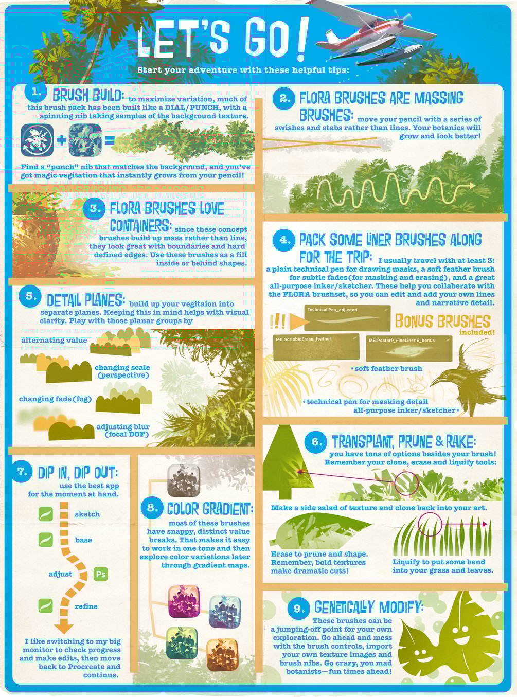 These brushes provide an excellent start for exploring mass and texture. Tuned for the iPad and Apple Pencil, they're great for illustrators, concept artists, designers, architects–just about any artist wanting to lay down some verdant growth.