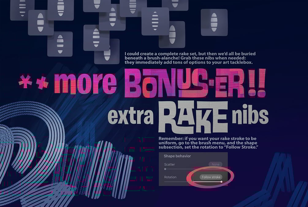 • 24 Rake Nibs: These can be imported as a shape source into any current brush in your library. It makes them super-flexible and a great way to augment the stroke of any brush. I've given you a black nib set and a grey one too. Use the grey nibs as a way to dampen the stroke flow if the darker ones prove too potent. nifty!