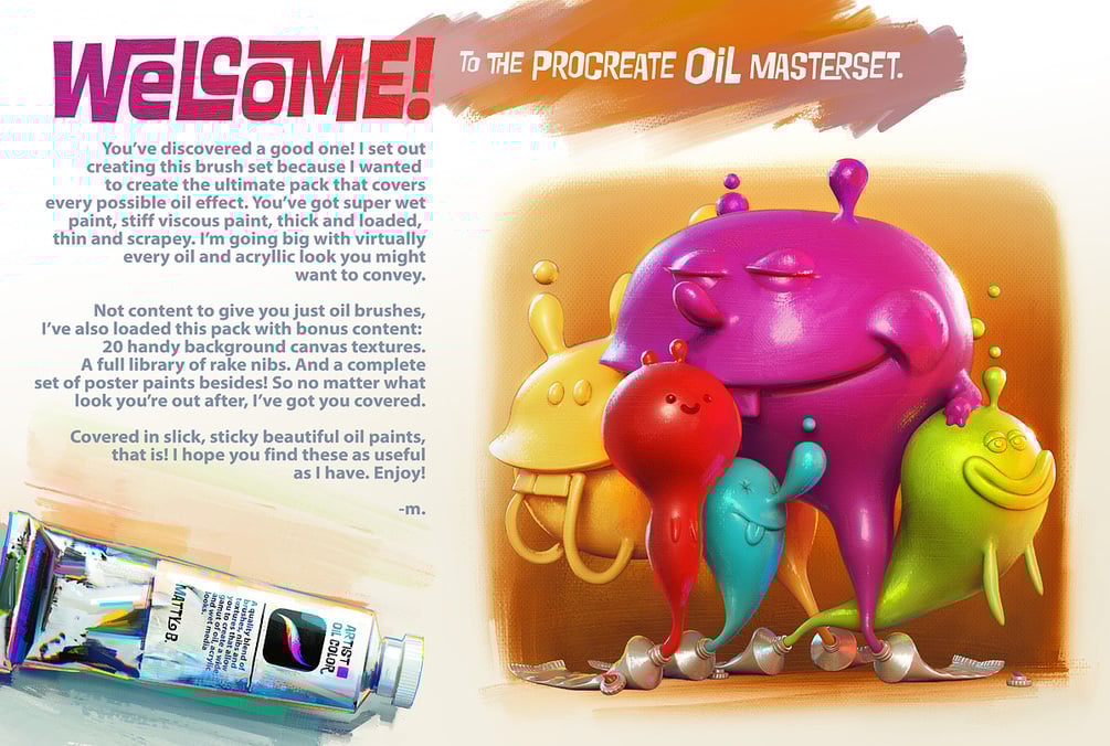Welcome to the Procreate OIL MasterSet! It's a big bundle: Over 300 oil media brushes. They're all-new and exclusive to this set. I've got you covered for any oil effect you might want, from thick and slick to thin and scrapey. Lean to fat, you have tons of options! To see brush examples, check out this link.