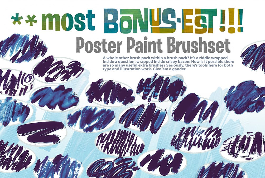 • 63 Additional Poster Paint Brushes: To make sure you have all the marks all the time, I've given you this set for free as well! This brushset is full of specialty liners and display tools, great for both illustration and type work.