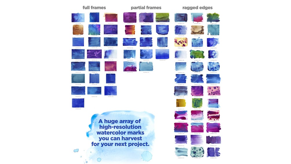 105 Watercolor images divided into 5 categories: Full Frames, Partial frames, Ragged Edges, Patches and Drops. This image library includes: