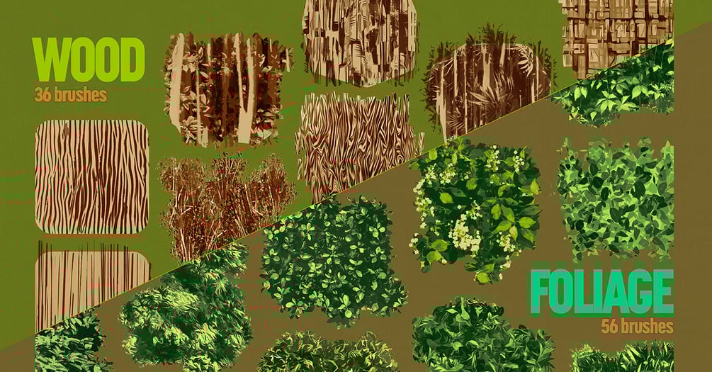 • Foliage brushes–all brand new! spread growing vegitation in your art.